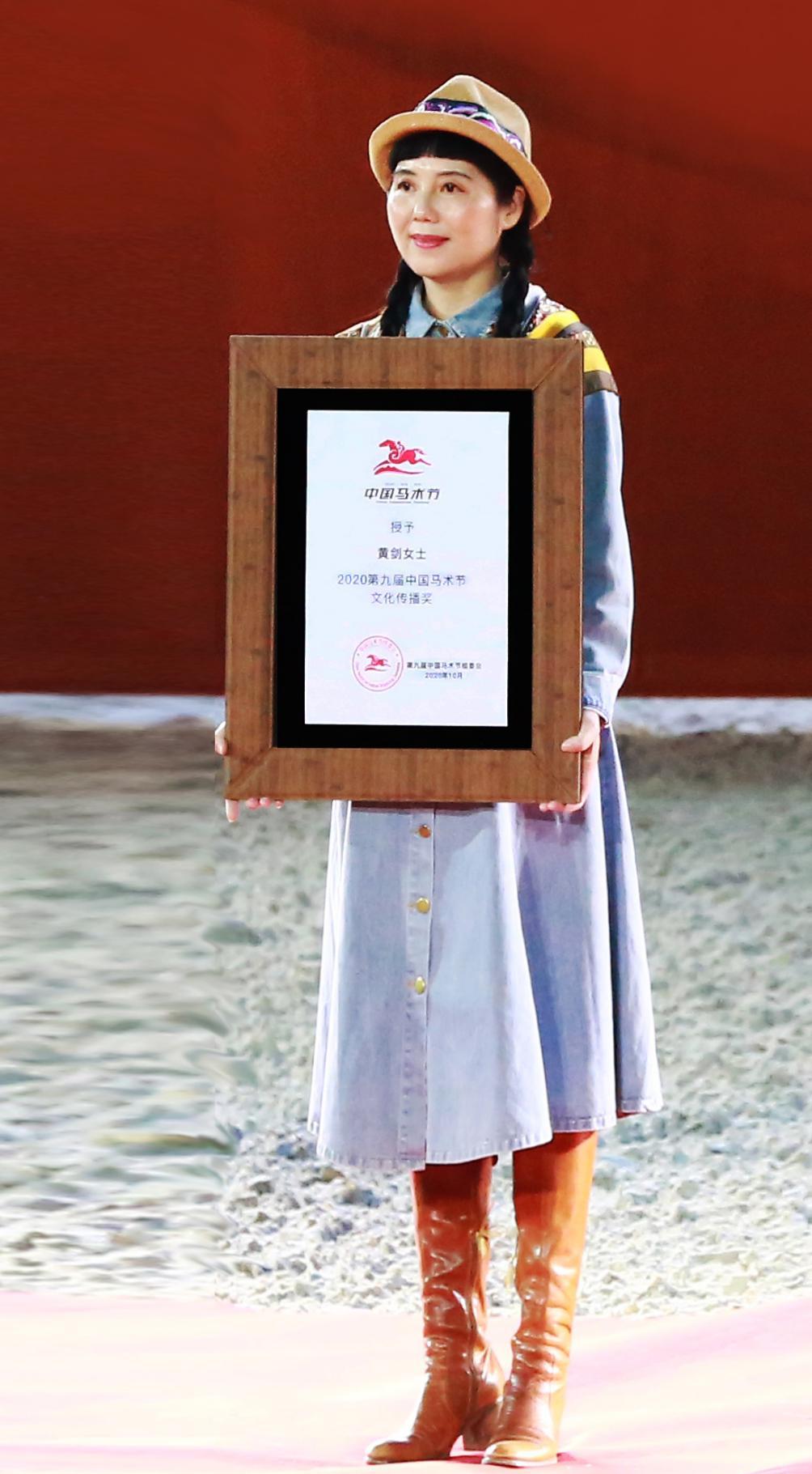 鉴于黄剑对国际马术运动和中国马文化传播所作出的杰出贡献,组委会在马术节闭幕式上特授予黄剑“马文化传播奖”的荣誉。黄剑发表了获奖感言,她表示将继续用雕塑艺术传播马术文化,助力新时期中国马术文旅产业的发展,同时,为中国马业名城安平铸魂添彩。