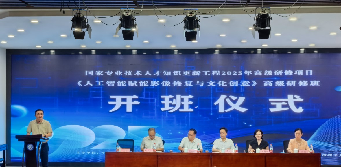 刘朝晖在致辞中表示,学校高度重视科研创新与人才培养,希望学员们在学习中开阔视野、提升能力,把所学应用于实践,助力行业发展。周光明指出,本次研修是落实人社部2025年高级研修项目计划的重要举措,人工智能赋能影像修复与文化创意,为文化传承和科技创新带来新机遇。他勉励学员们紧跟技术前沿,加强交流研讨,努力成长为推动文化与科技融合的中坚力量。