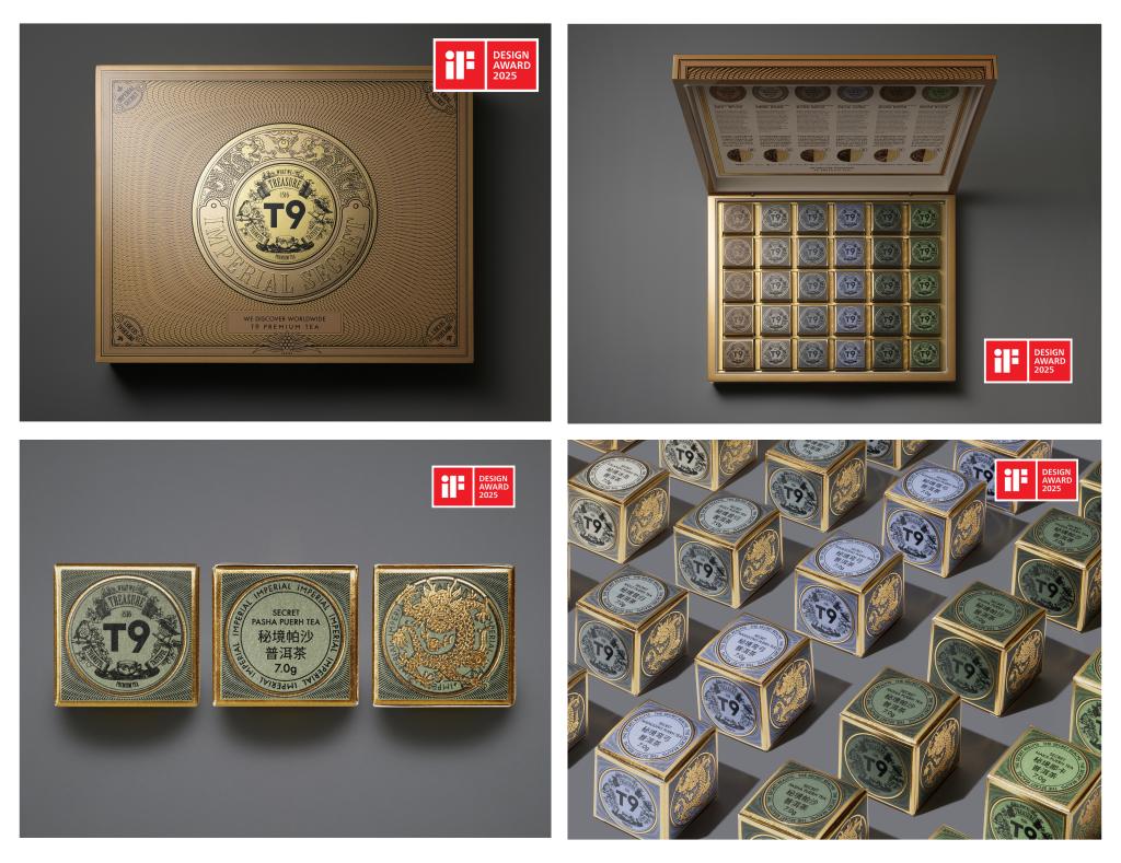 王龙老师的获奖作品《T9 The Secret Realms》,整体设计不仅服务于品牌识别与产品保护,更通过视觉与触觉的双重体验,引导消费者进入一个关于茶源、工艺与品饮的“秘境之旅”。T9通过此设计成功地将传统普洱茶文化转化为现代都市生活场景中的高端消费品,展现出中国茶品牌在国际舞台上的设计力与创新力。