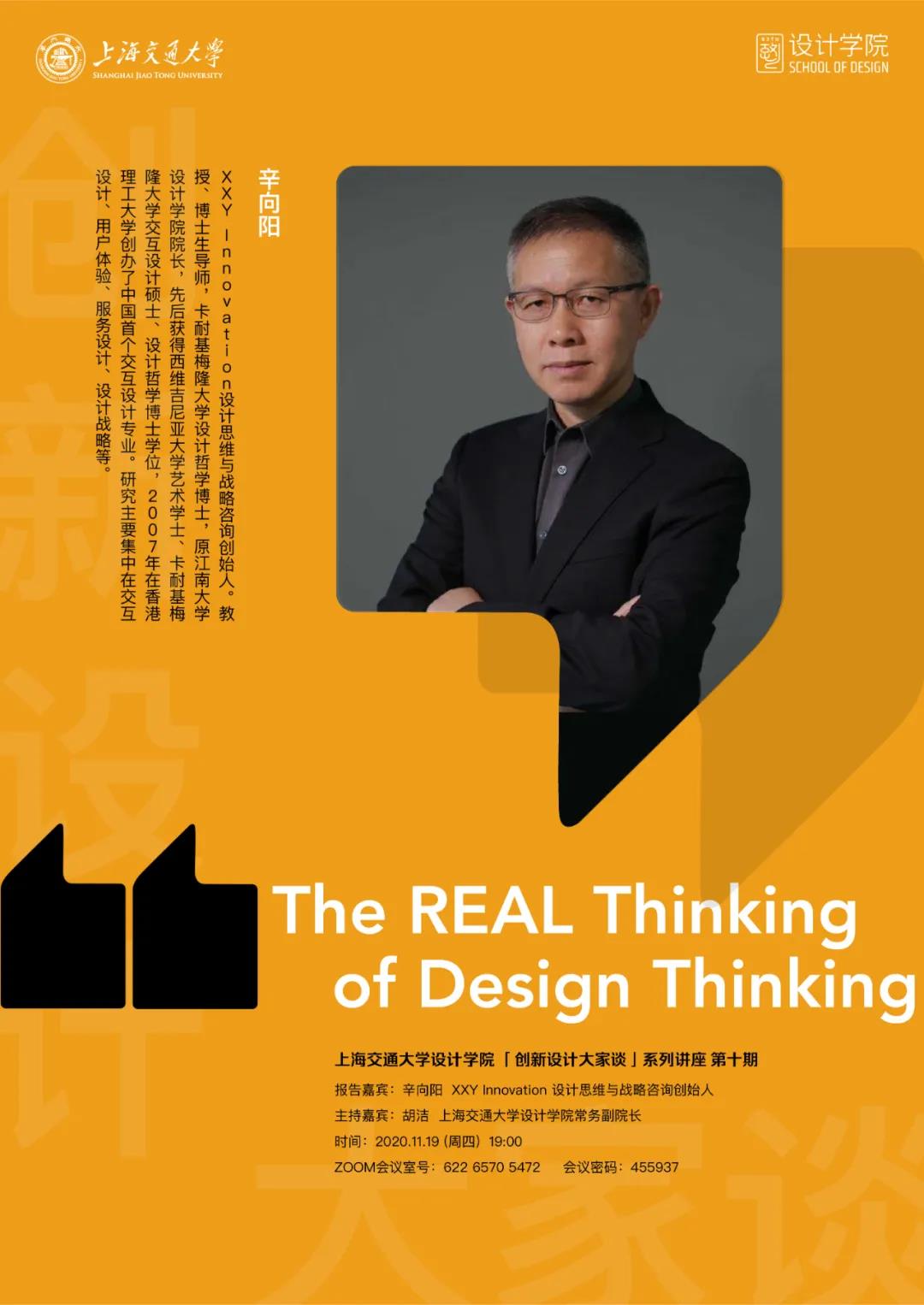11月19日下午,学院组织师生线上参与上海交通大学设计学院“创新设计大家谈”系列讲座,本次讲座由辛向阳教授主讲,主题为“The Real Thinking of Design Thinking”。