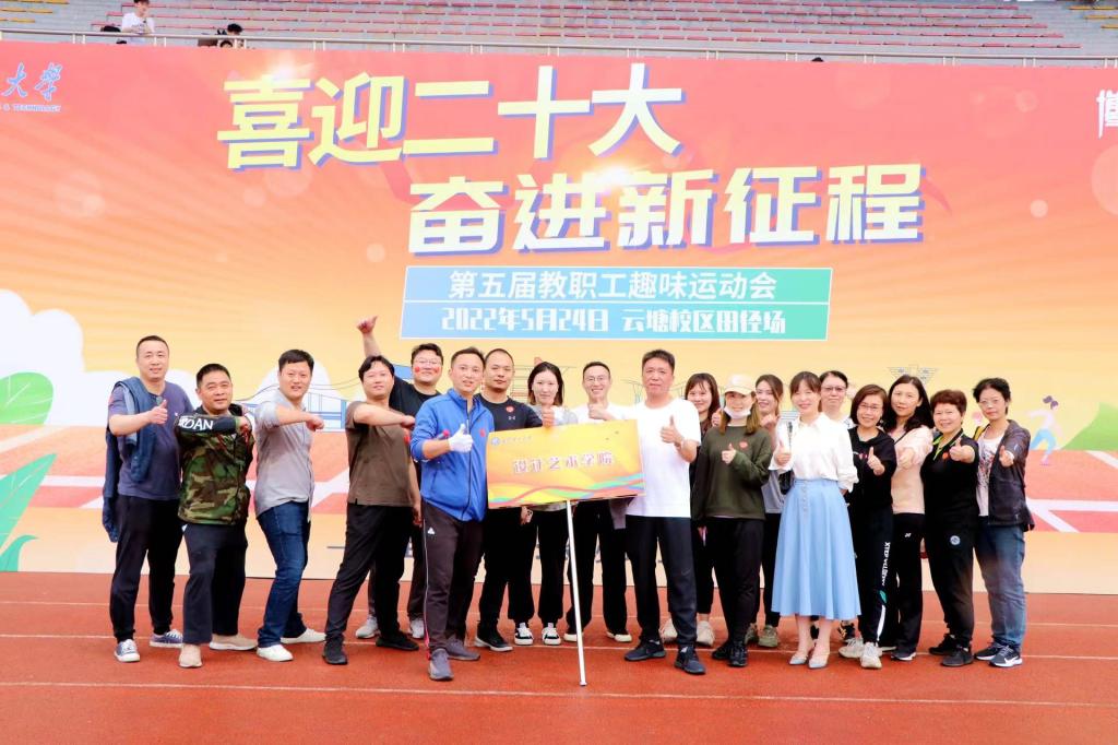 为了推动全民健身运动,增强教职工的身体素质,增进教职工之间的交流与协作,激励广大教职工以健康、积极、向上的精神面貌迎接党的二十大胜利召开,2022 年 5 月 24 日下午,我院组织代表队参加了学校“喜迎党的二十大,奋进新征程”为主题的第五届教职工趣味运动会。