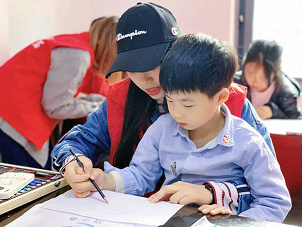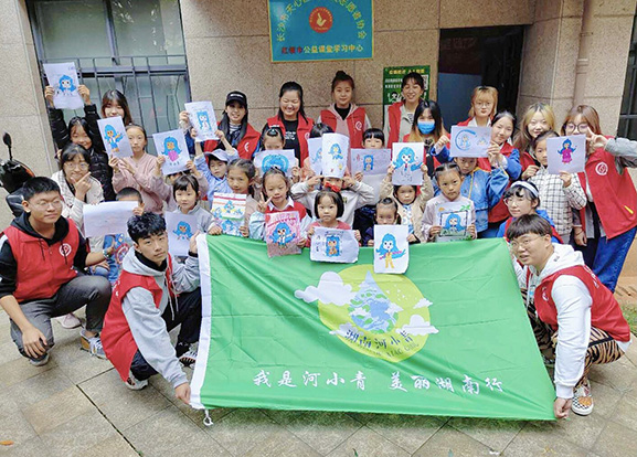 “红领巾公益课堂,让孩子快乐成长”的标语映入眼帘,本次志愿服务开展目的也志在于此。首先,志愿者以“河小青”的卡通形象介绍为带入点,对本次活动进行简单介绍以此拉近与小朋友之间的距离。随后,在志愿者的悉心指导引导下,小朋友们从观察到构图再到填色,一笔一画绘出他们对色彩的感悟以及对艺术的好奇。孩子们也在自己亲自体验中,感受到绘画所带来的无穷乐趣。活动最后,全体人员合影留念。