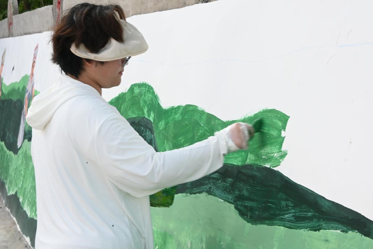 本次墙绘活动的主要目标是对杨柳镇一面长墙进行设计和绘制。事先,同学们结合当地产业特色和民族文化,制定了以农户采茶为主题的设计方案,展示了乡村振兴的新风貌:“产业兴旺、生态宜居、生活富裕、乡风文明、治理有效”。