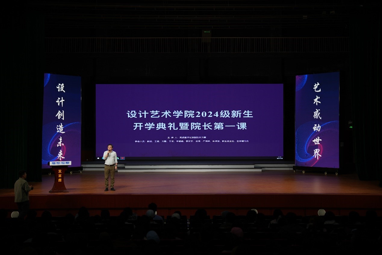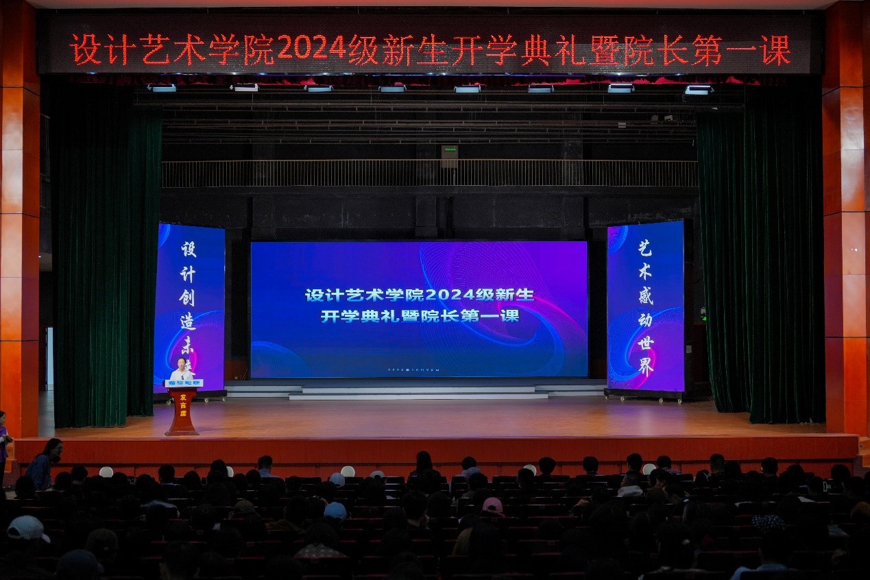 2024年10月8日下午,设计艺术学院2024级新生开学典礼暨院长第一课在云塘大会堂举行。学院党委书记郭剑、院长王健、学院班子成员出席典礼。新生班主任、全体辅导员以及全体2024级新生参加。开学典礼由学院党委副书记、副院长万馨主持。
