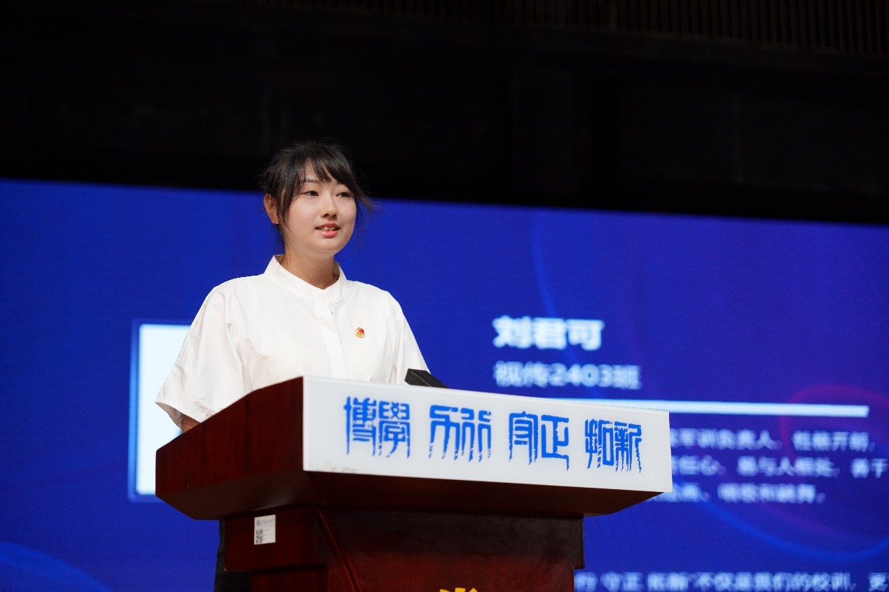 新生代表视传2403班的刘君可同学发言。她表达了自己对大学生活的期待和憧憬,并号召全体新生要用知识的力量武装自己,用创新的思维开拓未来,用坚韧的意志去面对一切困难与挫折,勇敢地迎接每一次挑战,勇敢地追逐自己的梦想,用努力和奋斗,为自己的人生画卷添上最绚丽的色彩。
