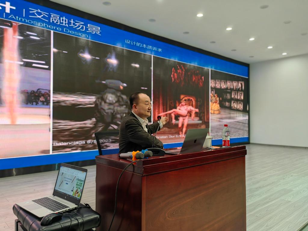 同时,任文东教授用当下国内外丰富生动的案例,向在场师生们展现了极具前沿性的艺术设计作品,强调设计学科在“AI时代”下应该思考艺术与科技、人与科技的关系等问题,指出广大学生们在学习专业基础知识的过程中,应该不断更新知识结构,提高艺术素养。他还分析了不同学科交叉融合的重要性,认为应该在艺术设计创作的过程中融入不同学科的内容,让设计作品更具有设计美感和未来科技感,并且能够为社会需求所服务。