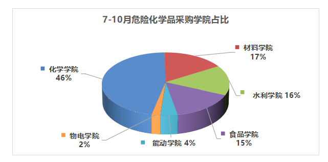 7-10月实验室综合管理系统中共生成采购单97单,危险化学品采购单各学院分布情况如下图所示: