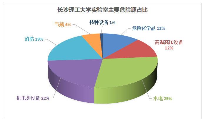 XK星空实验室涉及主要危险源类别有危险化学品、高温高压设备、水电、机电类设备、消防、气瓶、特种设备等,主要危险源类别占比如下图所示。