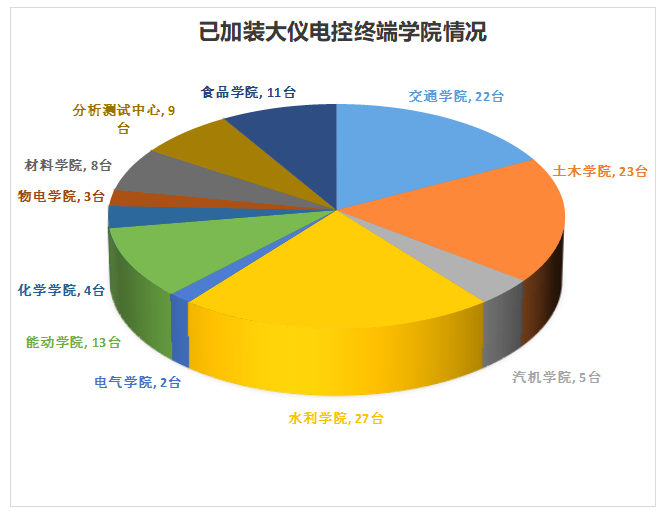 为实现实验仪器设备与仪器共享平台数据联动及实时控制,学校已对部分单价高、共享需求大的贵重精密仪器加装了电脑显示器电源控制终端。第一批加装电源控制终端的大仪由学院自主申请、实验与资产处现场核查确定。已加装电源控制终端的实验仪器设备情况如下图(单位:台套):