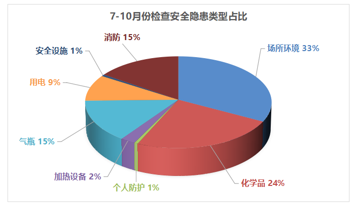 7-10月校级实验室安全现场检查共发现162个安全隐患,其中实验室场所环境隐患53个,化学品隐患39个,消防安全隐患25个,气瓶隐患24个,用电隐患15个,加热设备隐患4个,个人防护和安全设施隐患各1个。