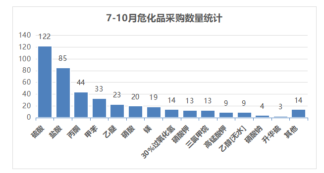 7-10月共采购了各类危险化学品425瓶,其种类数量统计如下图所示