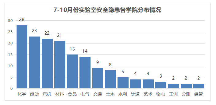 7-10月份实验室安全现场检查各学院所发现安全隐患如下图所示: