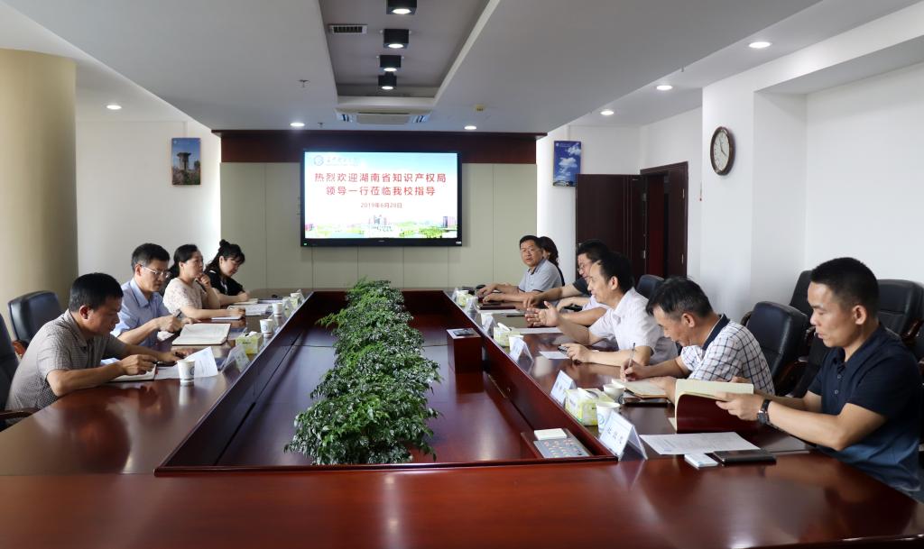 6月28日下午,湖南省知识产权局局长段志雄带领知识产权运用处处长何萍、知识产权运用处副处长周卫、知识产权促进处副处长李涛一行来XK星空调研知识产权中心建设工作。校长曹一家、副校长杨伟军及科研部、图书馆、成果转化(知识产权)中心相关负责人出席了座谈会。座谈会由杨伟军主持。