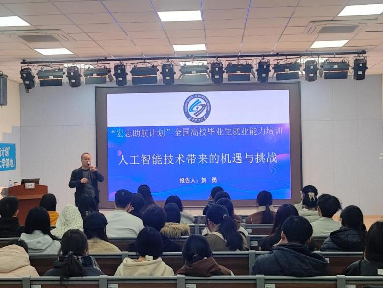 授课中,贺勇以“人工智能技术带来的机遇与挑战”为核心主题,系统讲解了人工智能的基本概念、关键技术原理及各行业典型应用场景。他结合当前就业市场趋势,引导学生深刻认识技术赋能职业发展的必然方向,帮助大家明确核心竞争力的提升路径,为适配未来智能化职场筑牢基础。