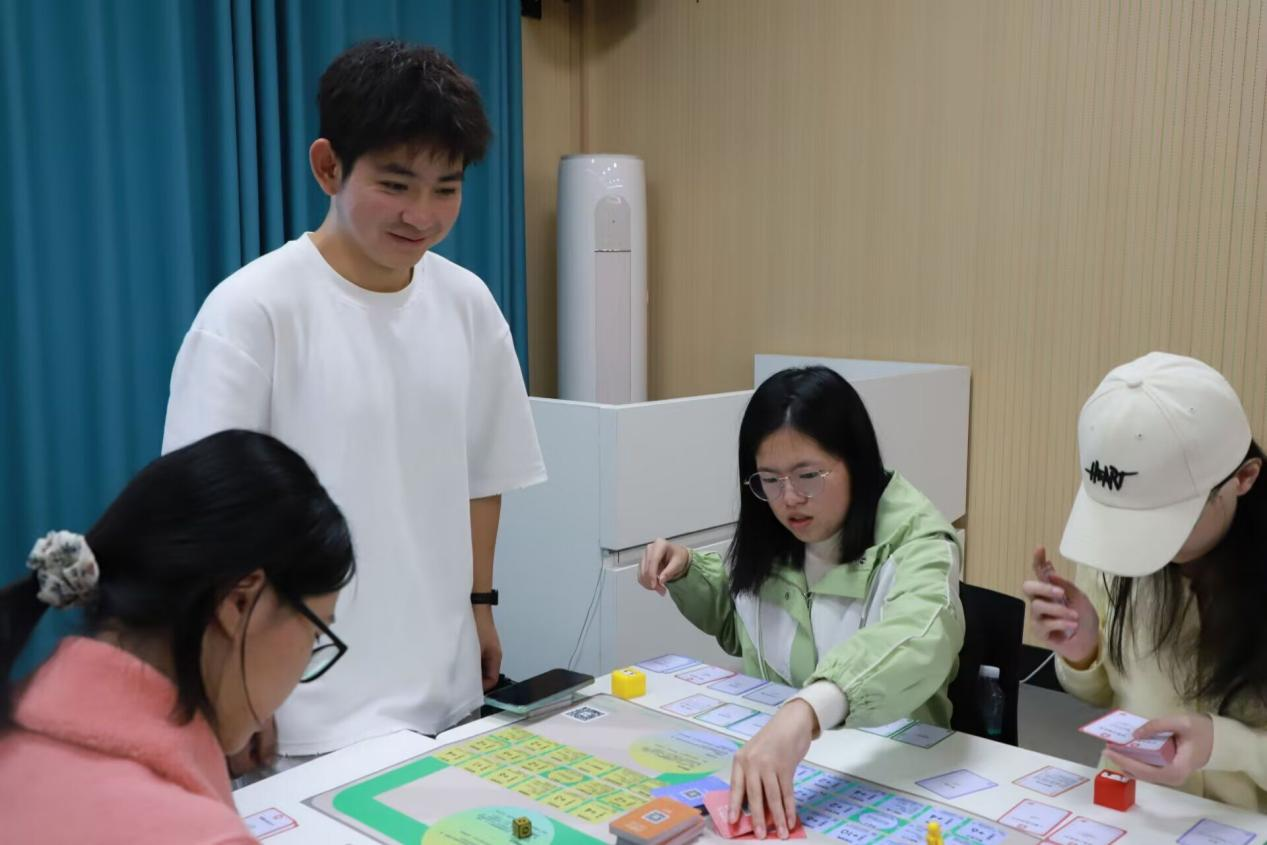 课程现场,朋辈导师们褪去“学长学姐”的身份标签,化身贴心的“职业引路人”。他们结合自身专业、实习实践、备战考研考公等真实经历,用同龄人的视角拆解职业规划难点,分享求职避坑技巧,传授备考实用策略。课堂上,既有干货满满的经验分享,也有一对一的互动答疑。随后,学生在朋辈导师带领下,沉浸式体验“步步为赢”、“价值观竞选”、“职场过山车”三款团体辅导实训教具,分别助力厘清生涯规划、梳理职业价值取向、提升职场应变与协作能力。课后,朋辈导师通过线上社群持续为学弟学妹答疑解惑,分享行业动态、招聘信息,搭建起常态化交流桥梁,实现“一次课程、长期赋能”。