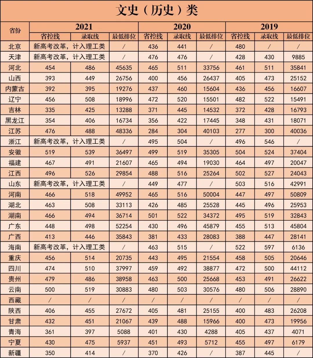 近三年在各省(市)录取分数及最低位次一览表